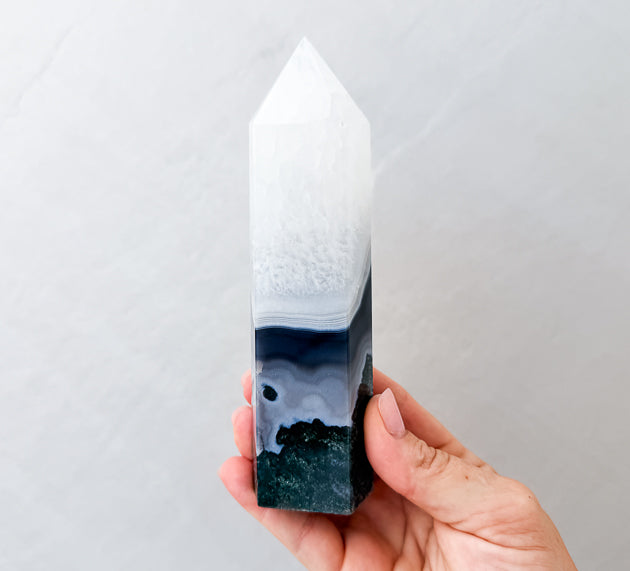 Each Moss Agate Tower is hand-selected for its organic inclusions, forest-like patterning, and natural variation. No two pieces are the same, each one a unique reflection of nature’s artistry.