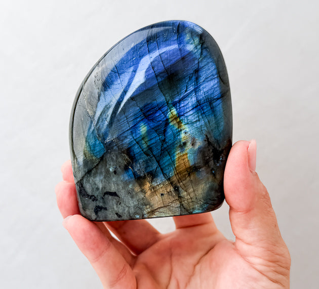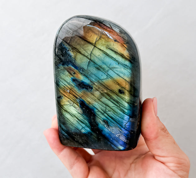 Labradorite enhances intuition, strengthens spiritual awareness, and aids in navigating periods of change. It activates both the third eye and throat chakras, making it ideal for mantra work, journaling and inner reflection—a powerful crystal for self-discovery and aligned communication.
