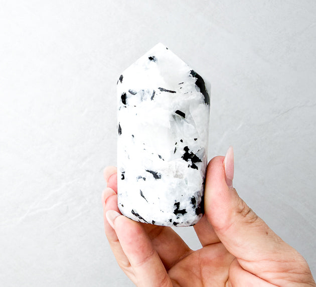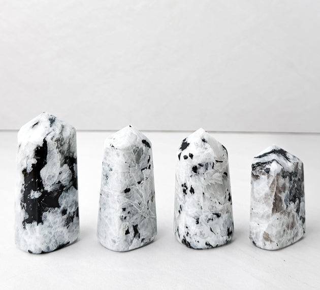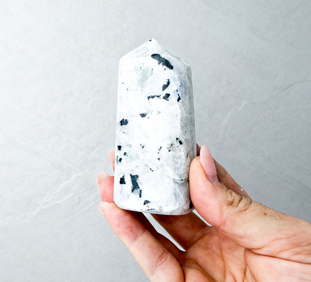 Each Rainbow Moonstone Tower is one-of-a-kind and hand-selected for its stunning flash and grounding energy. You will receive the exact piece shown.